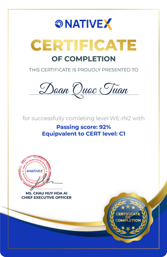 Chứng nhận được cấp cho học viên hoàn thành khóa học với kết quả đạt >60% theo chuẩn CEFR.