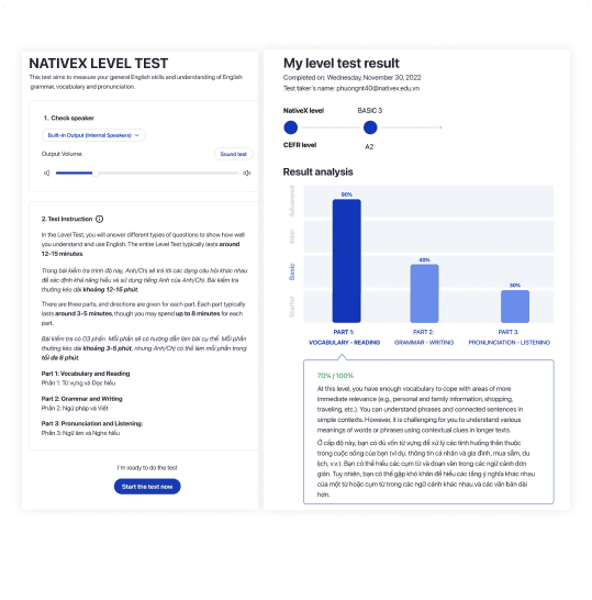 Làm bài kiểm tra trình độ online theo chuẩn CEFR và nhận tư vấn lộ trình học tiếng Anh được cá nhân hóa dành riêng cho bạn.