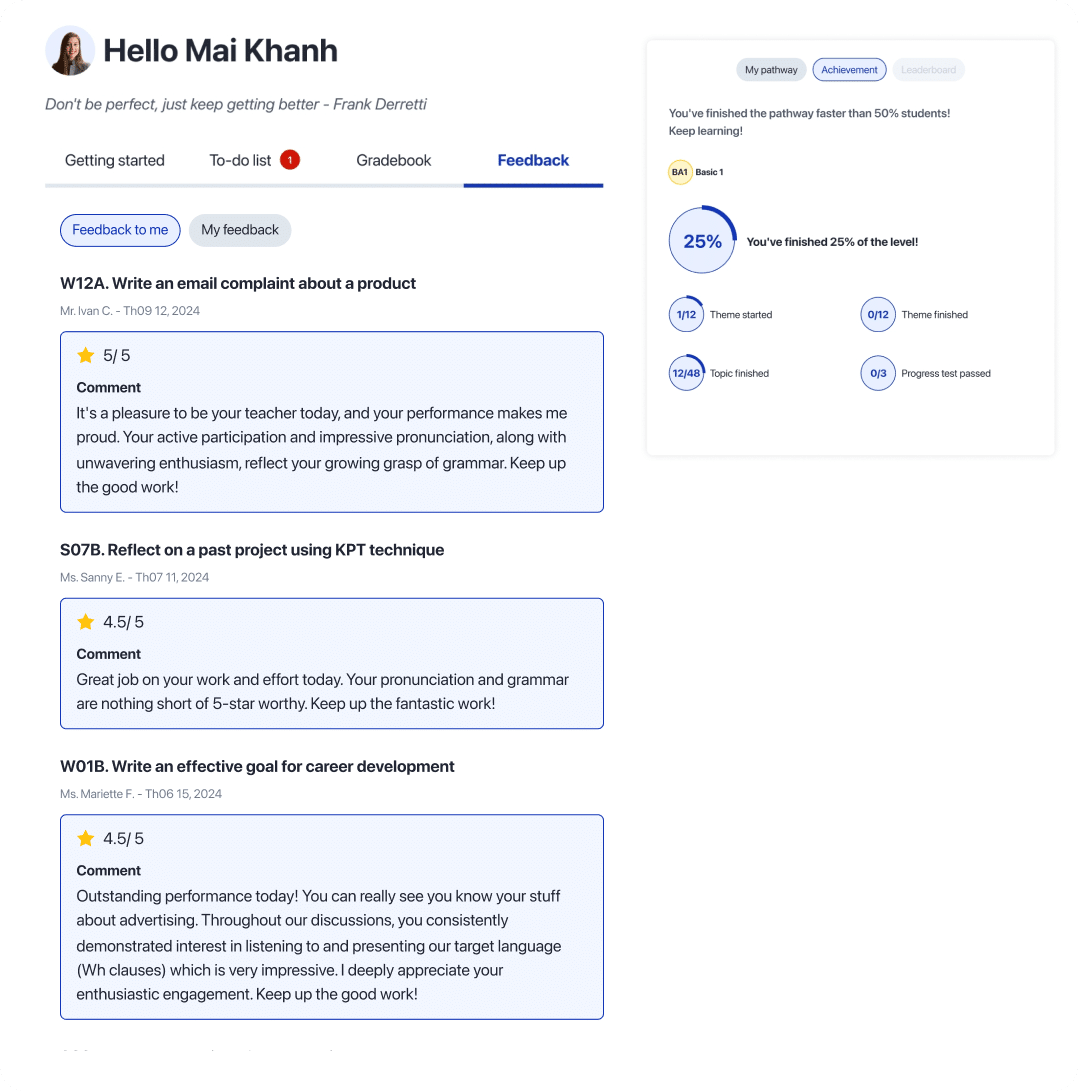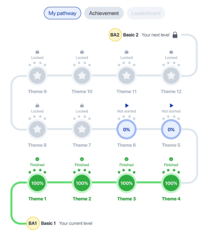 Lộ trình học được quản lý trên giao diện trực quan để dễ dàng theo dõi tiến độ học tập.