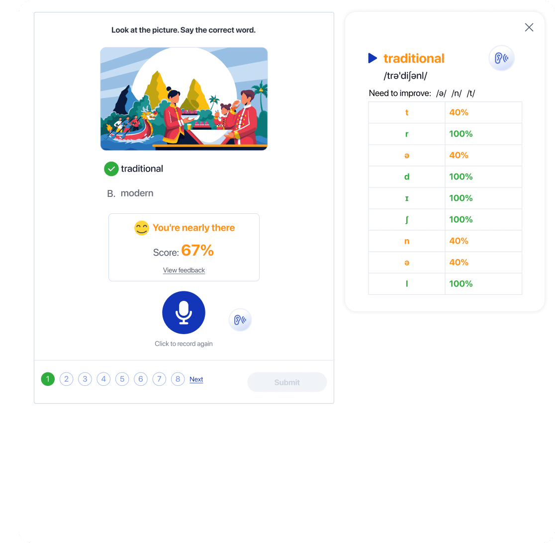 Các bài tập luyện phát âm sẽ được AI chấm điểm đến từng âm tiết để cải thiện ngữ điệu của bạn.