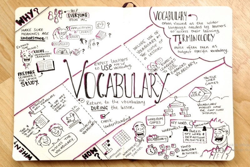 Tất nhiên, bạn thường cảm thấy mệt mỏi khi nhìn vào một trang sổ đầy chữ. Để việc học từ vựng hiệu quả hơn, bạn có thể vẽ hình hoặc ký tự kế bên từ vựng thay vì viết nghĩa bằng Tiếng Việt hoặc Tiếng Anh.