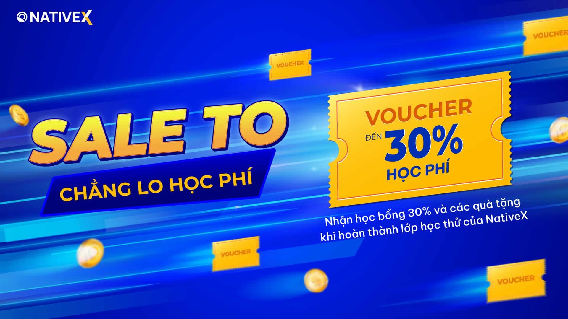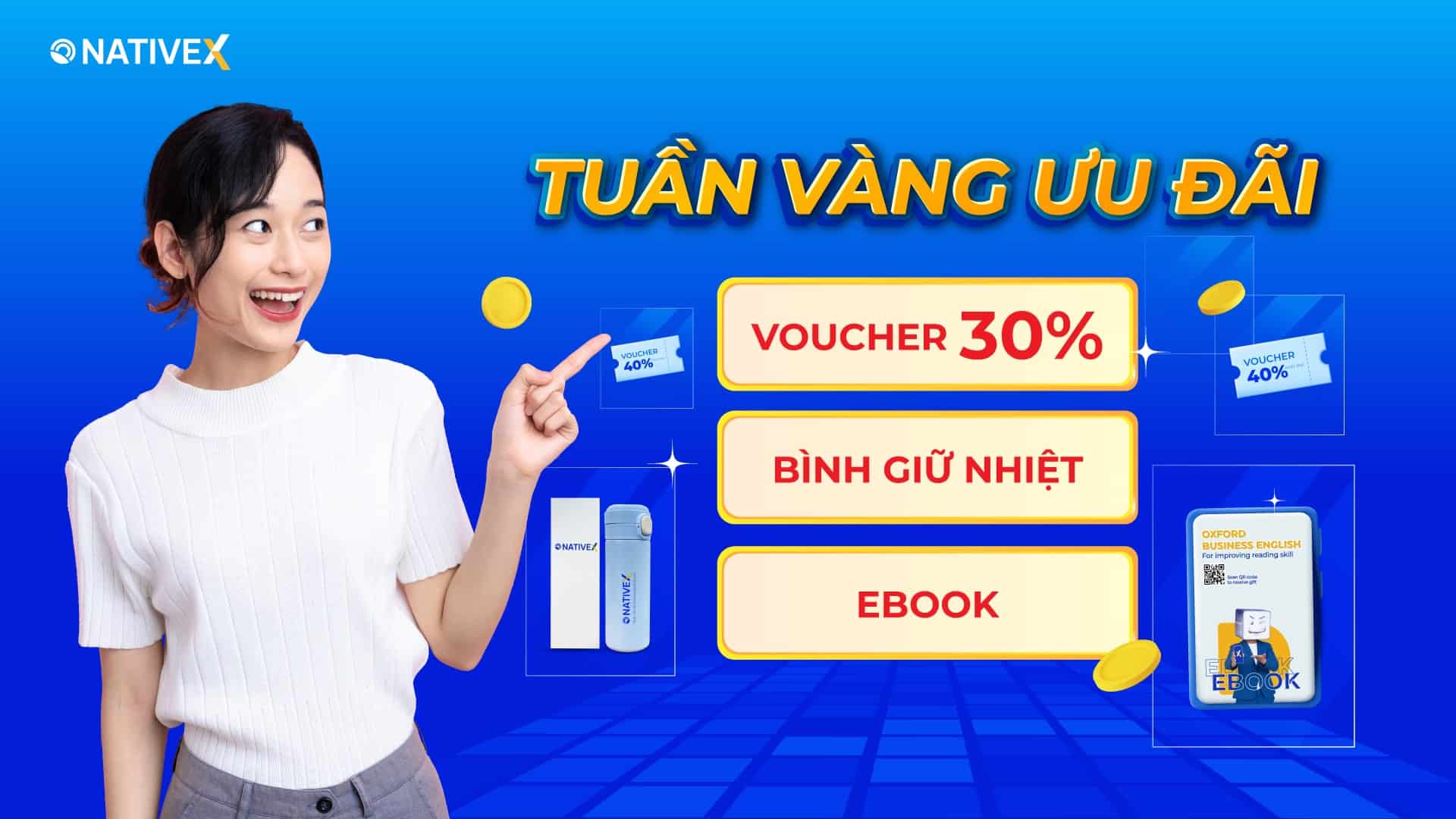Nhân "Tuần vàng ưu đãi", NativeX dành tặng bạn riêng cho bạn ưu đãi đặc biệt để nâng trình tiếng Anh. - Voucher ưu đãi lên đến 30% học phí - Quà tặng Bình giữ nhiệt NativeX - Bộ Ebook tiếng Anh (giải thích chi tiết ngữ pháp tiếng Anh
