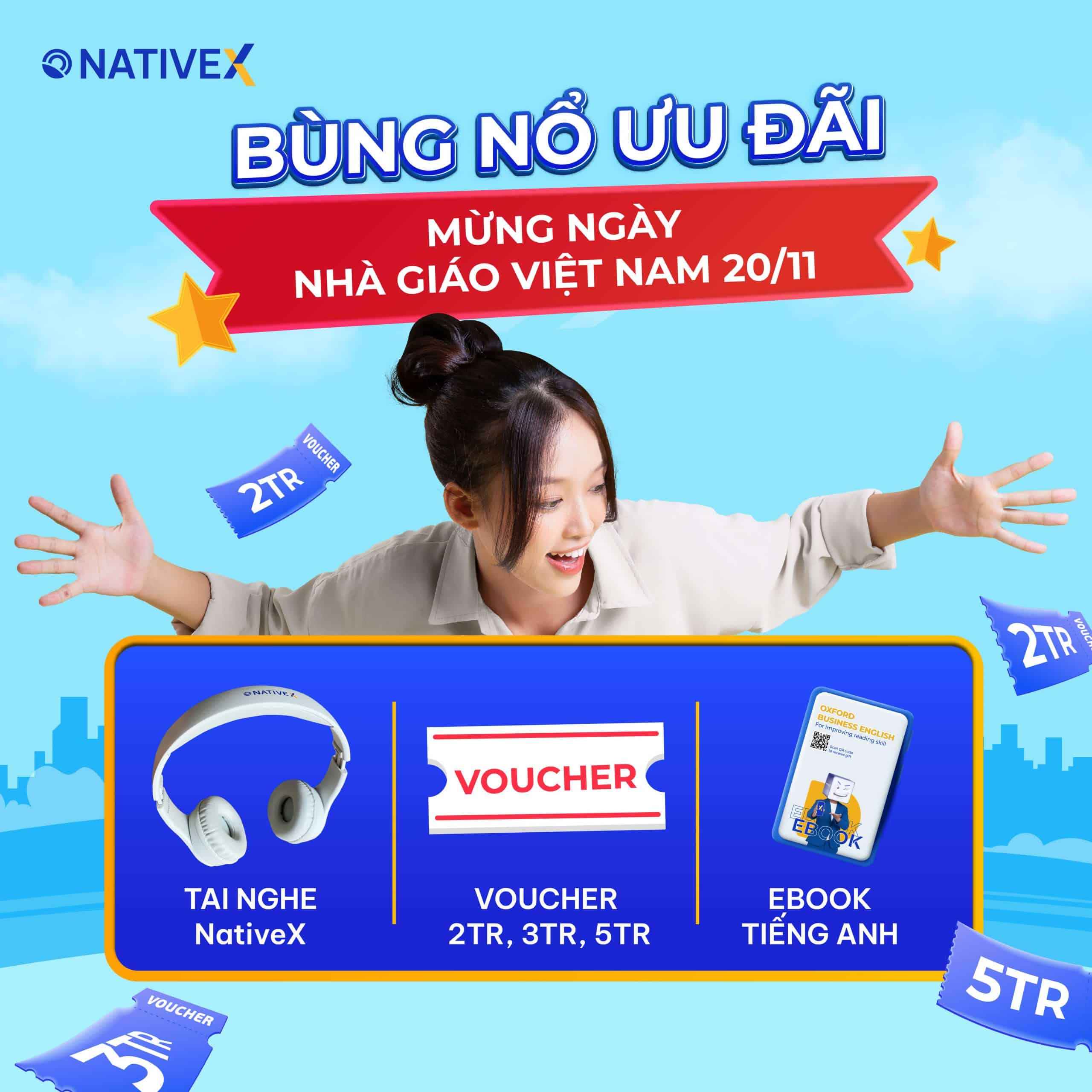 Ngày nhà giáo 20/11 này, NativeX dành tặng bạn riêng cho bạn ưu đãi đặc biệt để nâng trình tiếng Anh và các quà tặng khi hoàn thành lớp học thử của NativeX Đối tượng áp dụng: dành cho 100 học viên đăng ký sớm nhất khóa học t