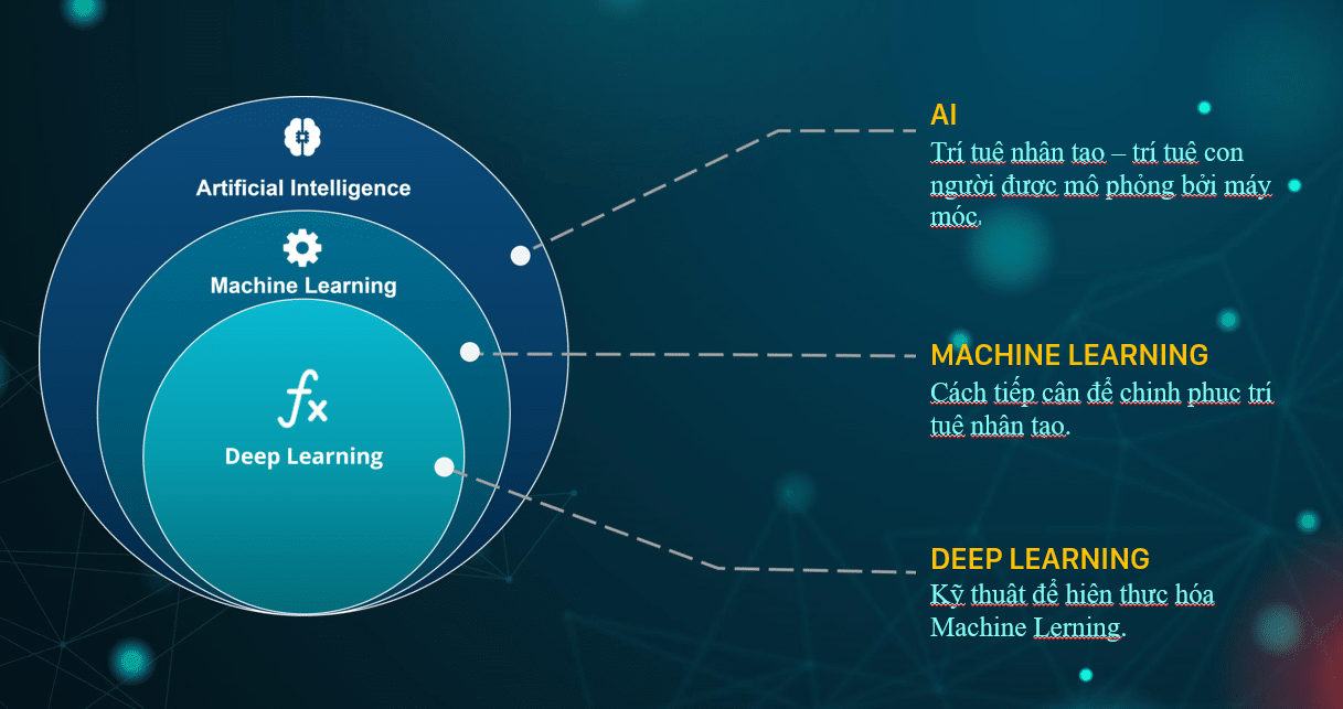 Trí tuệ nhân tạo (AI), Machine Learning (học máy), và Deep Learning (học sâu) là các khái niệm có liên quan nhưng khác biệt trong lĩnh vực công nghệ và dữ liệu. AI là khái niệm bao quát nhất, trong khi Machine Learning là một phân nhánh của AI tập trung vào việc học từ dữ liệu. Deep Learning, lại là một phần của Machine Learning, sử dụng các mạng nơron sâu để xử lý dữ liệu phức tạp. Hiểu rõ sự khác nhau giữa các khái niệm này sẽ giúp bạn áp dụng đúng công nghệ cho các bài toán và ứng dụng cụ thể.